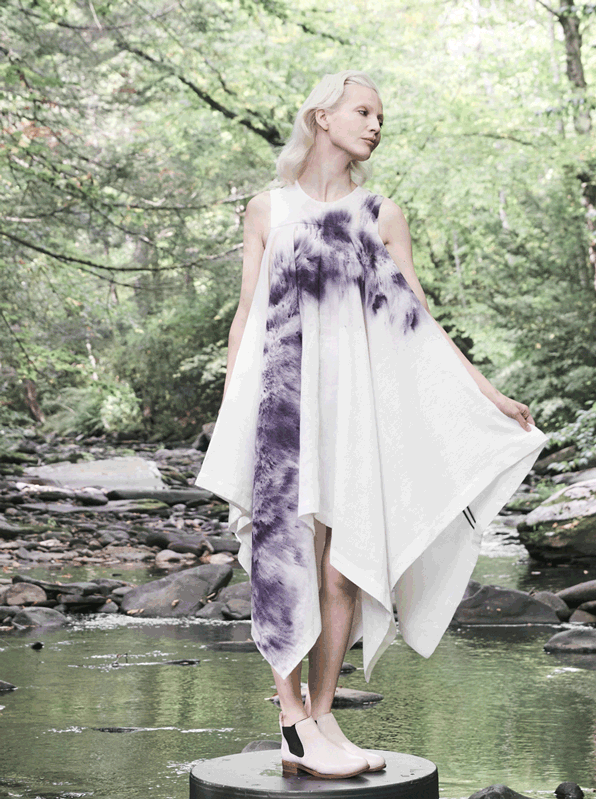 The push and pull of dual natures forms the backbone of Titania Inglis’s spring 2017 collection, Chimère: long and short silhouettes reveal and conceal, while unexpected fabric combinations add a layered twist: veg-tanned leather straps on a Belgian linen dress, or crisp organic cotton twill layered over silky cupro. Details include natural dyes sprinkled and smudged across garments to create flowing streams of gray-purple color, while silhouettes range from our signature sleek bias gowns to a boxy mini, wide-leg linen jumpsuit, and flowing, voluminous linen dresses. As always, all styles are designed and produced in New York from high-quality, low-impact fabrics.